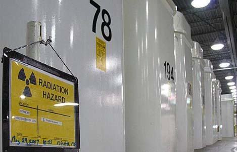 | All the nuclear fuel that has ever been used at Pickering is stored in a warehouse on site. These containers have 60-centimetre thick concrete walls and another two centimetres of steel. More than a decade after being filled with spent uranium, the walls of the containers are still warm. |