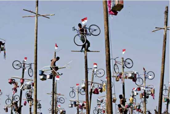 prizes Indonesian men climb greased poles to retrieve prizes such as bicycles and rice cookers as part of an Independence Day celebration Friday in Jakarta, Indonesia. Indonesians are celebrating the 62nd anniversary of Independence from Dutch colonial rule. |