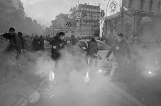 | Railway workers brandish flares and shout slogans during a demonstration in Paris on Wednesday. Striking transport workers cut train service and forced commuters and travellers to walk, bike or skate to work in a pivotal standoff with President Nicolas Sarkozy over his bid to cut labour protections. | |||||