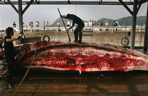 Japanese spectators watch a Beard´s Beaked whale being slaughtered in the Japanese port city of Wada